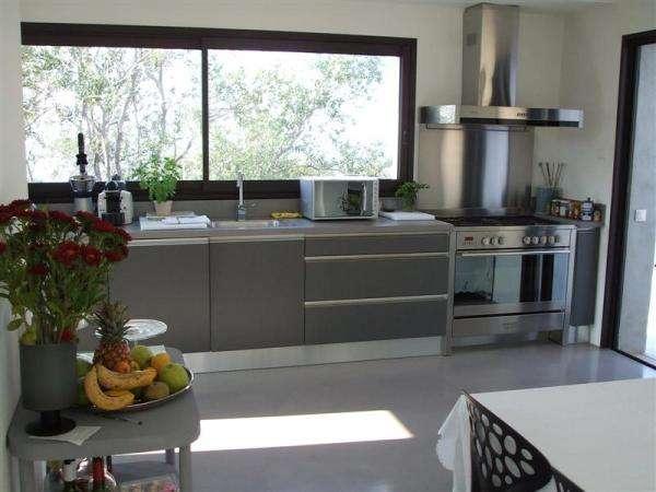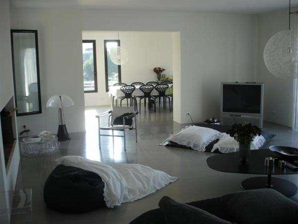 La villa se divise en deux niveaux: Au premier niveau, une belle cuisine moderne et toute équipée ouverte sur un très grand séjour avec cheminée moderne.